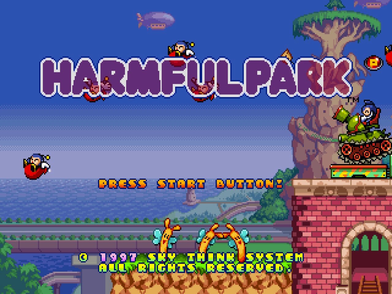 After having fun with Parodius, I decided to give another “cute ‘em up” a try with Harmful Park. I played with the Japanese translation which is to say I have no idea what the story means, if there is one. I can say it’s a straightforward, forgiving, and fun horizontally scrolling shooter. Instead of the Gradius style power ups, you have access to all of your weapons at all times. You can power up to get 2 sub guns which makes you pretty tough. I used the normal bullets and mowed everything down easily enough on “Easy” diffuculty. I went back and did the first 2 stages on “Very Hard” difficulty, and it still wasn’t so bad. This is definately not on the level of a Parodius game in terms of inventiveness, but it’s a great two player game you’re sure to have fun with.